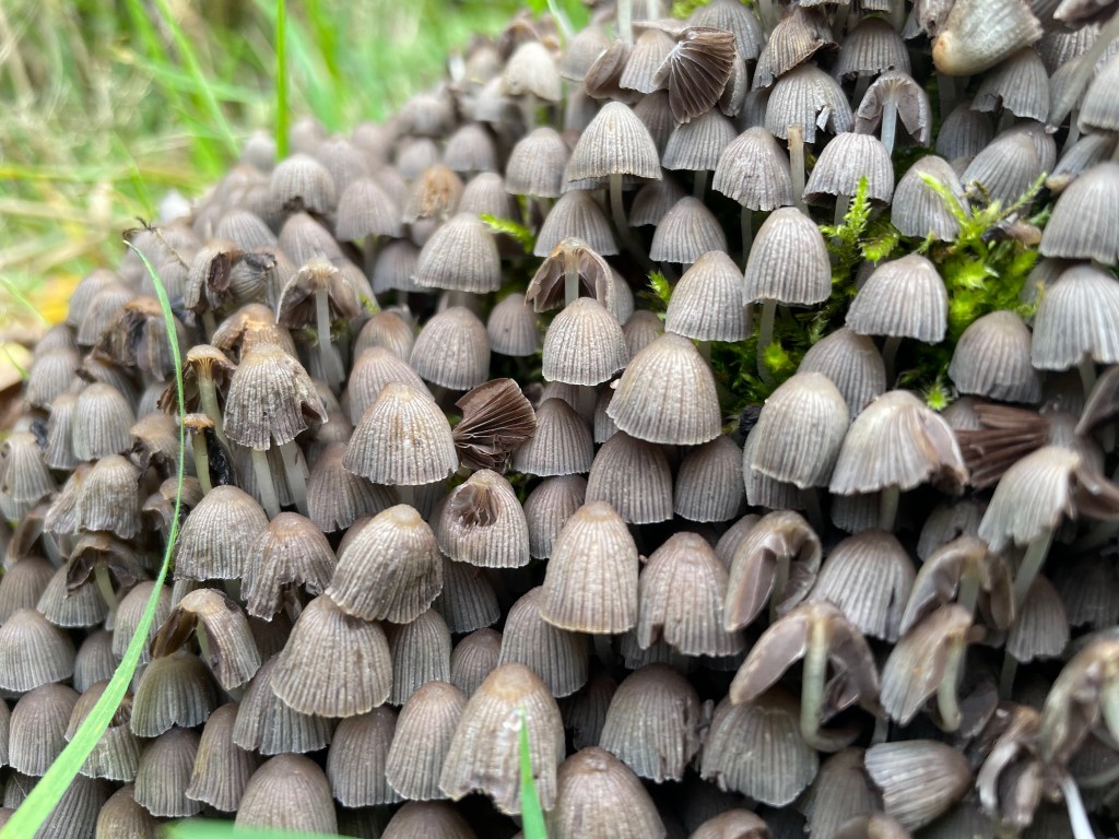 I spotted these tiny mushrooms on a walk in Rivington. I used iNaturalist to identify them, and according to Wikipedia they can be called fairy inkcap, fairy bonnet, or trooping crumble cap. Adorable!